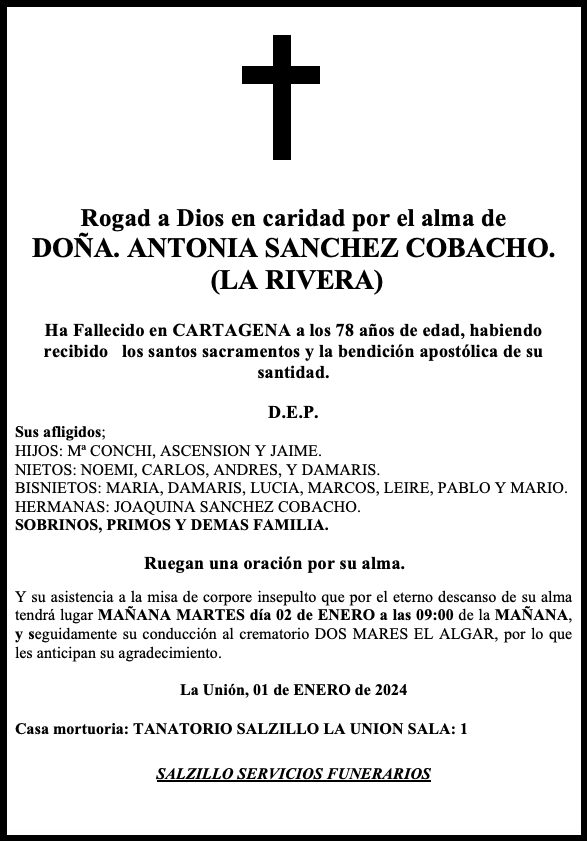 Sus afligidos hijos (Mª Conchi, Ascensión y Jaime), nietos (Noemi, Carlos, Andrés y Damaris), bisnietos (María, Damaris, Lucía, Marcos, Leire, Pablo y Marco), hermanas (Joaquina), sobrinos, primos y demás familia ruegan una oración por su alma y su asistencia a la misa de corpore insepulto que por el eterno descanso de su alma tendrá lugar este martes, día 2 de enero, a las 9 horas de la mañana, y seguidamente su conducción al crematorio Dos Mares de El Algar, por lo que les anticipan su agradecimiento.