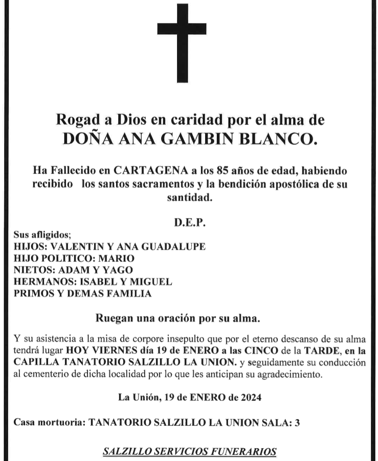 Sus afligidos hijos (Valentín y Ana Guadalupe), hijo político (Mario), nietos (Adam y Yago), hermanos (Isabel y Miguel), primos y demás familia ruegan una oración por su alma y su asistencia a la misa de corpore insepulto que por el eterno descanso de su alma tendrá lugar hoy, viernes 19 de enero, a las cinco de la tarde en la capilla de Tanatorio Salzillo La Unión, y seguidamente su conducción al cementerio de dicha localidad, por lo que les anticipan su agradecimiento.
