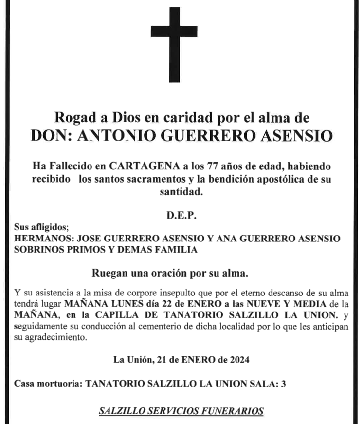 sus afligidos hermanos (José y Ana), sobrinos primos y demás familia ruegan una oración por su alma y su asistencia a la misa de corpore insepulto que por el eterno descanso de su alma tendrá lugar este lunes, día 22 de enero, a las 9.30 horas de la mañana, en la capilla de Tanatorio Salzillo La Union y, seguidamente, su conducción al cementerio de dicha localidad, por lo que les anticipan su agradecimiento.