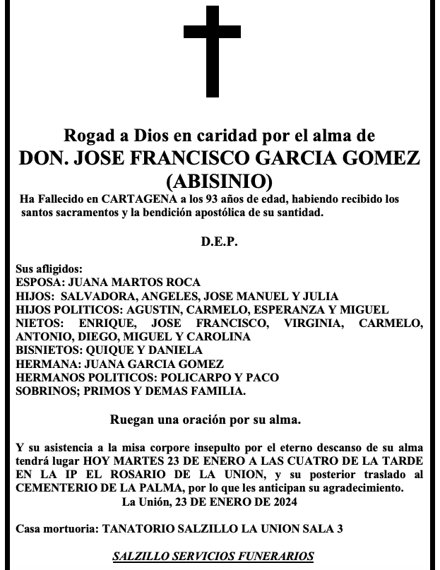 Sus afligidos esposa (Juana Martos Roca), hijos (Salvadora, Ángeles, José Manuel y Julia), hijos políticos (Agustín, Carmelo, Esperanza y Miguel), nietos (Enrique, José Francisco, Virgnia, Carmelo, Antonio Diego, Miguel y Carolina), bisnietos (Quique y Daniela), hermana (Juana), hermanos políticos (Policarpo y Paco), sobrinos, primos y demás familia ruegan una oración por su alma y su asistencia a la misa corpore insepulto por el eterno descanso de su alma tendrá lugar hoy, martes 23 de enero, a las cuatro de la tarde (16 horas), en la iglesia parroquial de Nuestra Señora del Rosario de La Unión, y su posterior traslado al cementerio de La Palma, por lo que les anticipan su agradecimiento.