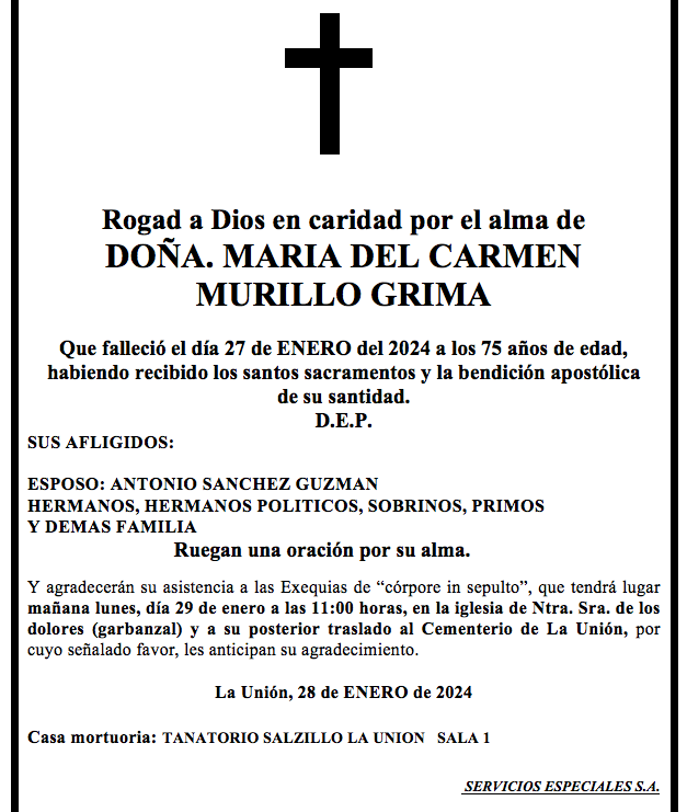 Sus afligidos esposo (Antonio Sánchez Guzmán), hermanos, hermanos políticos, sobrinos, primos y demás familia ruegan una oración por su alma y agradecerán su asistencia a las exequias de 'corpore in sepulto' que tendrán lugar este lunes, día 29 de enero, a las 1 horas, en la iglesia de Nuestra Señora de los Dolores (El Garbanzal) y a su posterior traslado al cementerio de La Unión, por cuyo señalado favor les anticipan su agradecimiento.