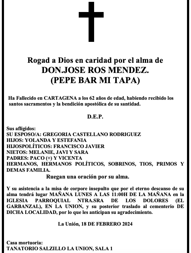 Su esposa (Gregoria Castellano Rodríguez), hijos (Yolanda y Estefanía), hijo político (Francisco Javier), nietos (Melanie, Javi y Sara), padres (Paco+ y Vicenta), hermanos, hermanos políticos, sobrinos, tíos, primos y demás familia ruegan una oración por su alma y su asistencia a la misa de corpore insepulto que por el eterno descanso de su alma tendrá lugar este lunes, a las 11 horas de la mañana, en la iglesia parroquia de Nuestra Señora de los Dolores de El Garbanzal (La Unión), y su posterior traslado al cementerio unionense, por lo que les anticipan su agradecimiento.