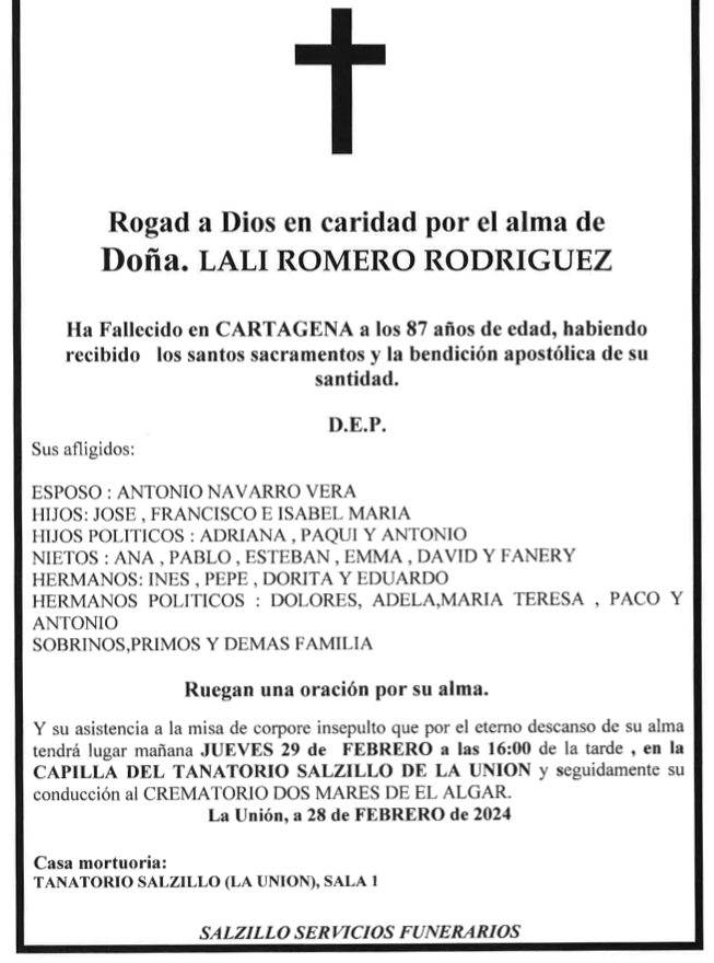 Sus afligidos esposo (Antonio Navarro Vera), hijos (José, Francisco e Isabel María), hijos políticos (Adriana, Paqui y Antonio), nietos (Ana, Pablo, Esteban, Emma, David y Fanery), hermanos (Inés, Pepe, Dorita y Eduardo), hermanos políticos (Dolores, Adela, María Teresa, Paco y Antonio), sobrinos, primos y demás familia ruegan una oración por su alma y su asistencia a la misa de corpore insepulto que por el eterno descanso de su alma tendrá lugar este jueves, 29 de febrero, a las 16 horas, en la capilla del Tanatorio Salzillo de La Unión y, seguidamente, su conducción al crematorio Dos Mares de El Algar.