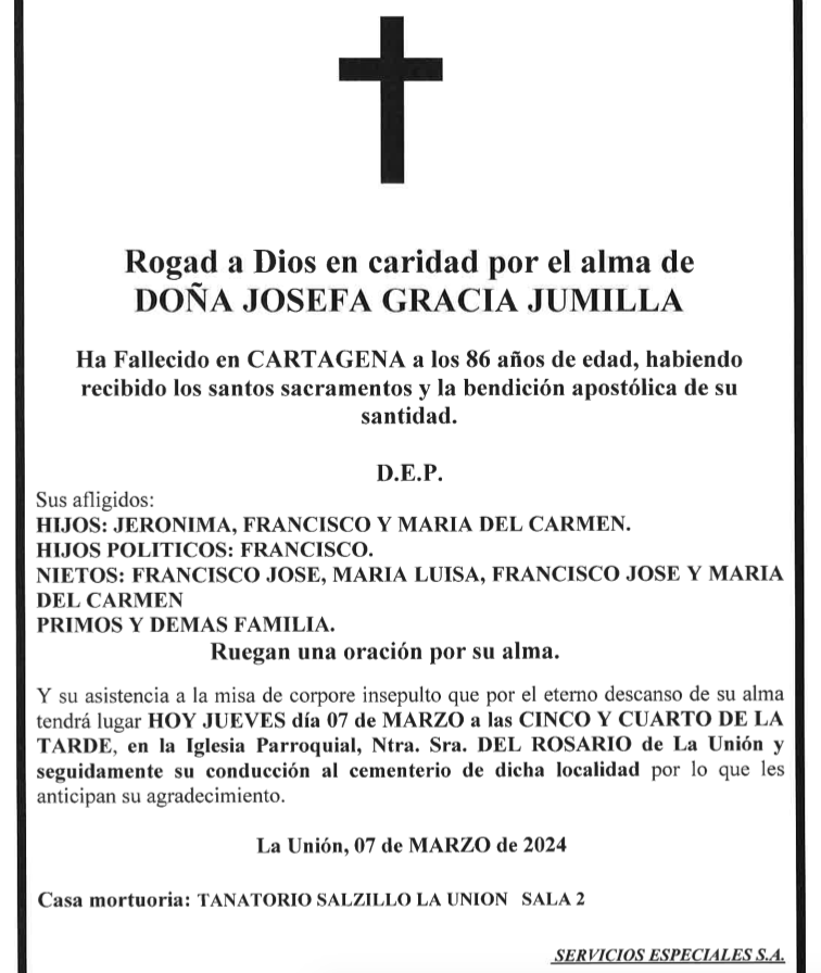 Sus afligidos hijos (Jerónima, Francisco y María del Carmen), hijo político (Francisco), nietos (Francisco José, María Luisa, Francisco José y María del Carmen), primos y demás familia ruegan una oración por su alma y su asistencia a la misa de corpore insepulto que por el eterno descanso de su alma tendrá lugar hoy, jueves día 7 de marzo, a las cinco de la tarde, en la iglesia parroquial de Nuestra Señora de los Dolores de La Unión y seguidamente su conducción al cementerio de dicha localidad por 1o que les anticipan su agradecimiento.