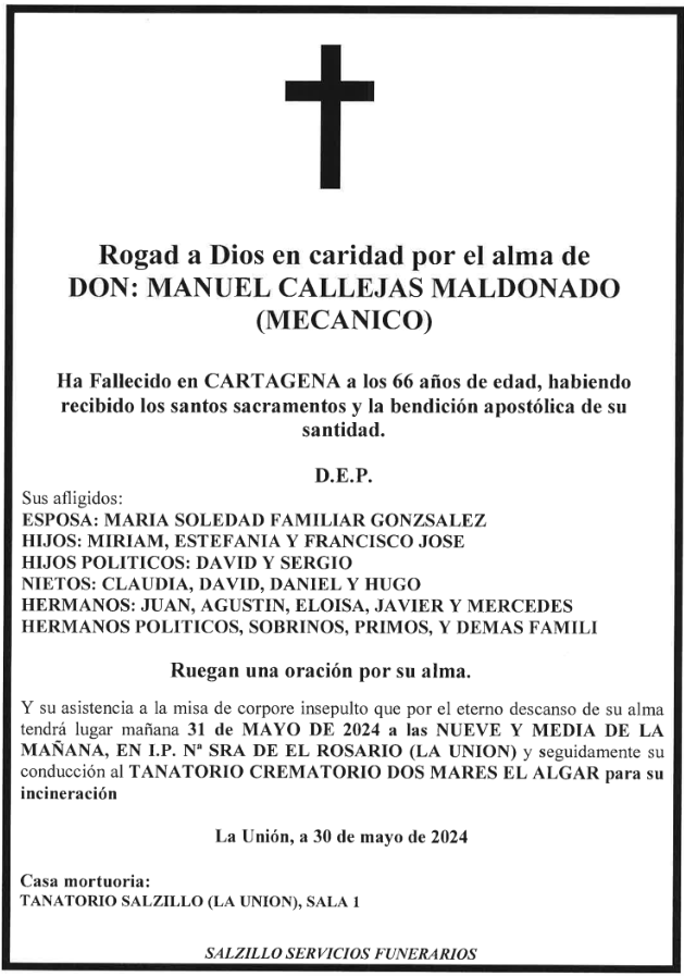 Sus afligidos esposa (María Soledad Familiar González), hijos (Miriam, Estefanía y Francisco José), hijos políticos (David y Sergio), nietos (Claudia, David, Daniel y Hugo), hermanos (Juan, Agustín, Eloisa, Javier y Mercedes), hermanos políticos, sobrinos, primos y demás familia ruegan una oración por su alma y su asistencia a la misa de 'corpore insepulto' que por el eterno descanso de su alma tendrá lugar este viernes, 31 de mayo, a las nueve y media de la mañana, en la iglesia parroquial de Nuestra Señora del Rosario (La Unión) y, seguidamente, su conducción al tanatorio crematorio Dos Mares de El Algar para su incineración