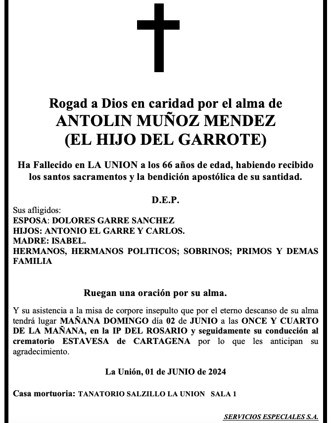 Sus afligidos esposa (Dolores Garre Sánchez), hijos (Antonio 'El Garre' y Carlos), madre (Isabel), hermanos, hermanos políticos, sobrinos, primos y demás familia ruegan una oración por su alma y su asistencia a la misa de 'corpore insepulto' que por el eterno descanso de su alma tendrá lugar este domingo, 2 de junio, a las once y cuarto de la mañana, en la iglesia parroquial de Nuestra Señora del Rosario y, seguidamente, su conducción al crematorio Estavesa de Cartagena, por lo que les anticipan su agradecimiento.