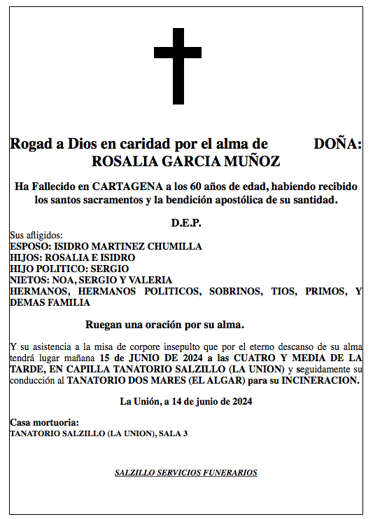 Sus afligidos esposo (Isidro Martínez Chumilla), hijos (Rosalía e Isidro), hijo político (Sergio), nitos (Noa, Sergio y Valeria), hermanos, hermanos políticos, sobrinos, tíos, primos y demás familia ruegan una oración por su alma y su asistencia a la misa de ‘corpore insepulto’ que por el eterno descanso de su alma tendrá lugar este sábado, 15 de junio, a las cuatro y media de la tarde, en la capilla del Tanatorio Salzillo La Unión y seguidamente su conducción al tanatorio Dos Mares de El Algar para su incineración.