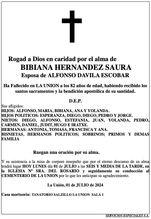 Sus afligidos hijos (Alfonso, María, Bibiana, Ana y Yolanda), hijos políticos (Esperanza, Diego, Diego, Pedro y Jorge), nietos (Diego, Alfonso, Estefanía, Juan, Yolanda, Pedro, Carmen, Daniel, Judit, Hugo e Iratxe), hermanas (Antonia, Tomasa, Francisca y Ana), bisnietas, hermanos políticos, sobrinos, primos y demás familia ruegan una oración por su alma y su asistencia a la misa de 'corpore insepulto' que por el eterno descanso de su alma tendrá lugar hoy, lunes, uno de julio, a las seis y media de la tarde, en la iglesia de Nuestra Señora del Rosario y, seguidamente, su conducción al cementerio de La Unión por lo que les anticipan su agradecimiento.