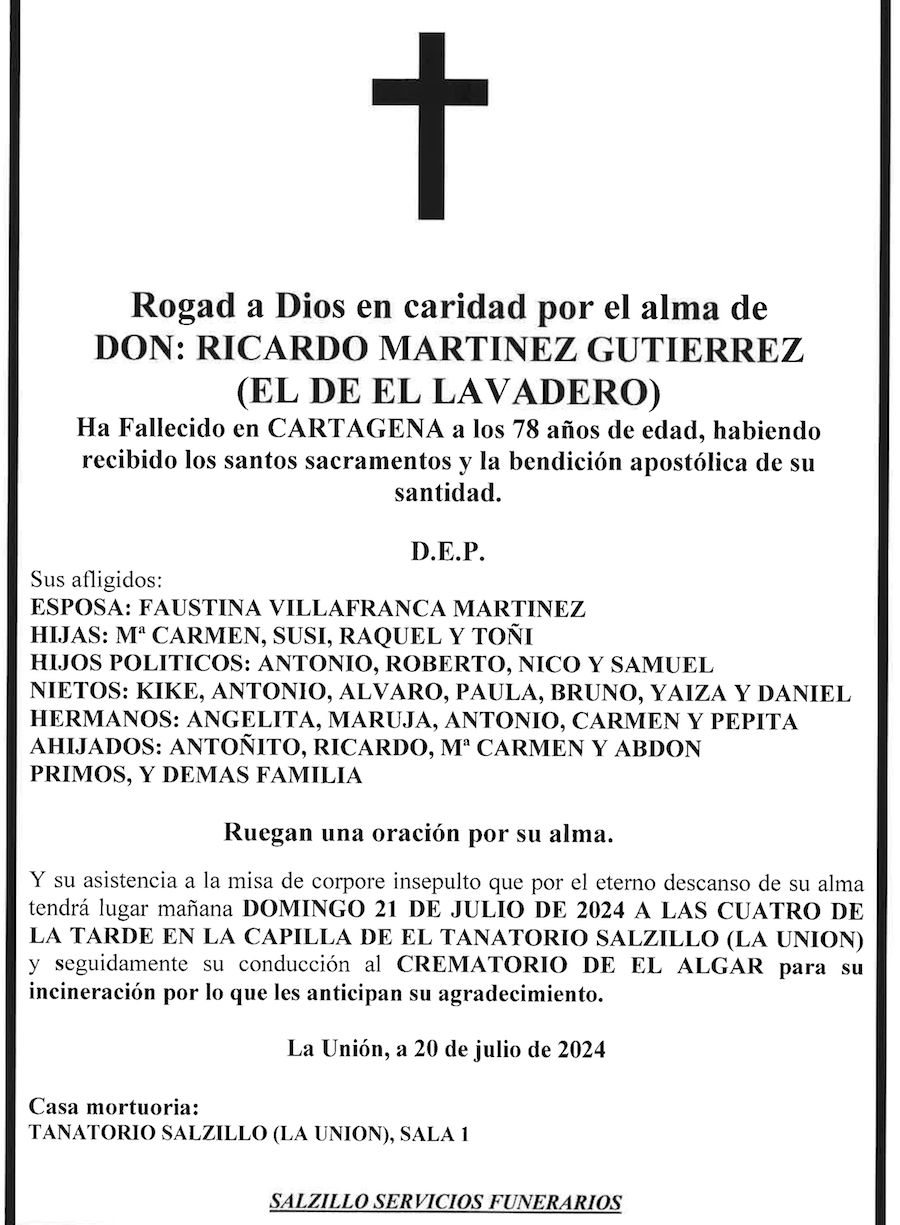 Sus afligidos espoa (Faustina Villafranca Martínez), hijas (Mª Carmen, Susi, Raquel y Toñi), hijos políticos (Antonio, Roberto, Nico y Samuel), nietos (Kike, Antonio, Álvaro, Paula, Bruno, Yaiza y Daniel), hermanos (Angelita, Maruja, Antonio, Carmen y Pepita), ahijados (Antoñito, Ricardo, Mª Carmen y Abdon), primos y demás familia ruegan una oración por su alma y su asistencia a la misa de corpore insepulto que por el eterno descanso de su alma tendrá lugar este domingo, 2l de julio de 2024, a las cuatro de la tarde en la capilla del Tanatorio Salzillo, en La Unión, y seguidamente su conducción al crematorio de El Algar, para su incineración, por lo que les anticipan su agradecimiento.