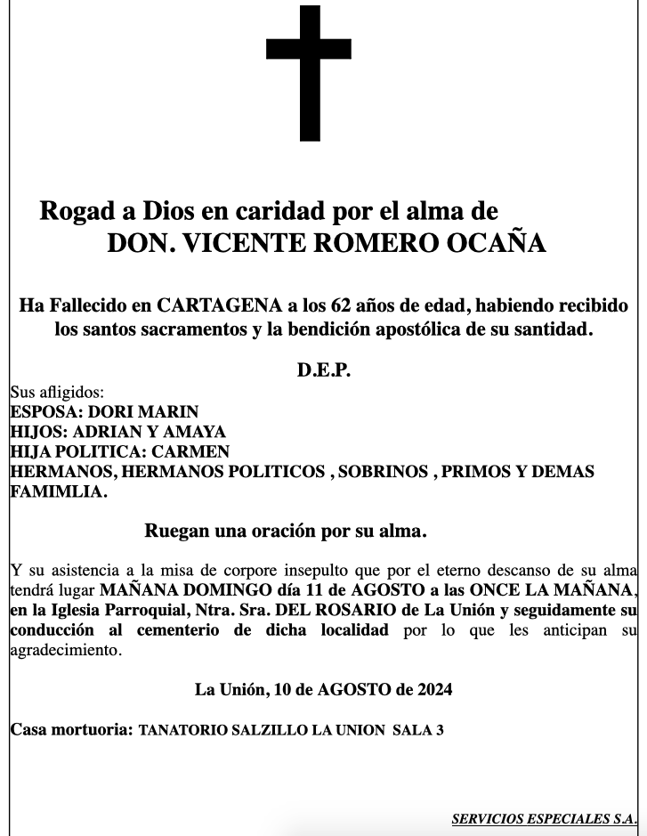 Sus afligidos esposa (Dori Marín), hijos (Adrián y Amaya), hija política (Carmen), hermanos, hermanos políticos, sobrinos, primos y demás familia ruegan una oración por su alma y su asistencia a la misa de 'corpore insepulto' que por el eterno descanso de su alma tendrá lugar este domingo, día 11 de agosto, a las once de la mañana en la iglesia parroquial de Nuestra Señora del Rosario de La Unión y, seguidamente, su conducción al cementerio de dicha localidad, por lo que les anticipan su agradecimiento.