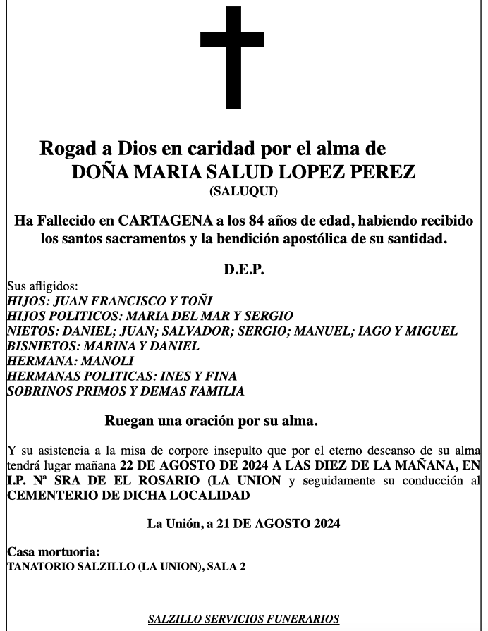 Sus afligidos hijos (Juan Francisco y Toñi), hijos políticos (María del Mar y Sergio), nietos (Daniel, Juan, Salvador, Sergio, Manuel Iago y Miguel), bisnietos (Marina y Daniel), hermana (Manoli), hermanas políticas (Inés y Fina), sobrinos, primos y demás familia ruegan una oración por su alma y su asistencia a la misa de corpore insepulto que por el eterno descanso de su alma tendrá lugar este jueves, 22 de agosto, a las diez de la mañana en la iglesia parroquial de Nuestra Señora del Rosario, en La Unión, y, seguidamente, su conducción al cementerio de la misma localidad.