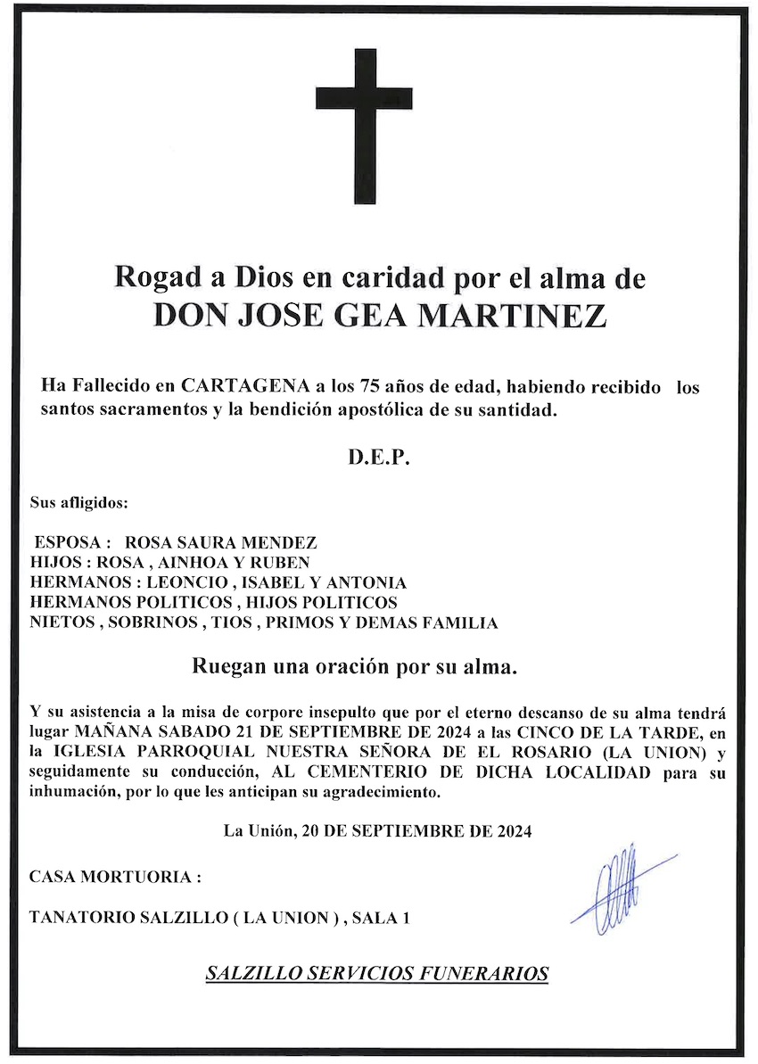 Sus afligidos esposa (Rosa Saura Méndez ), hijos (Rosa, Ainhoa y Rubén), hermanos (Leoncio, Isabel y Antonia), hermanos políticos, hijos políticos, nietos, sobrinos, tíos, primos y demás familia ruegan una oración por su alma y su asistencia a la misa de 'corpore insepulto' que por el eterno descanso de su alma tendrá lugar este sábado, 21 de septiembre, a las 17 horas, en la iglesia parroquial de Nuestra Señora del Rosario (La Unión) y, seguidamente, su conducción al cementerio de la misma localidad para su inhumación, por lo que les anticipan su agradecimiento.