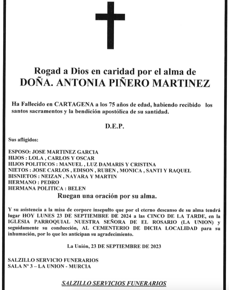 Sus afligidos esposo (José Martínez García), hijos (Lola, Carlos y Óscar), hijos políticos (Manuel, Lus Damaris y Cristina), nietos (José Carlos, Edison, Rubén, Mónica, Santi y Raquel), bisnietos (Neizan, Nayara y Martín), hermano (Pedro) y hermana política (Belén) ruegan una oración por su alma y su asistencia a la misa de 'corpore insepulto' que por el eterno descanso de su alma tendrá lugar hoy, lunes 23 de septiembre, a las cinco de la tarde en la iglesia parroquial de Nuestra Señora del Rosario, de La Unión, y seguidamente su conducción al cementerio de la misma localidad para su inhumación, por lo que les anticipan su agradecimiento.