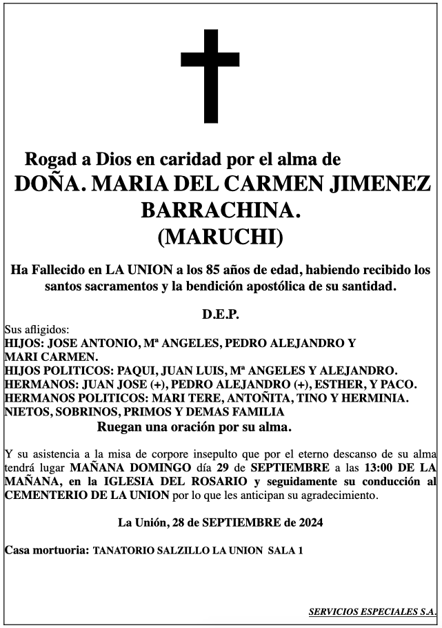 Sus afligidos hijos (José Antonio, María Ángeles, Pedro Alejandro y Maricarmen), hijos políticos (Paqui, Juan Luis, María Ángeles y Alejandro), hermanos (Juan José+, Pedro Alejandro+, Esther y Paco), hermanos políticos (Maritere, Antoñita, Tino y Herminia), nietos, sobrinos, primos y demás familia ruegan una oración por su alma y su asistencia a la misa de 'corpore insepulto' que por el eterno descanso de su alma tendrá lugar este domingo, 29 de septiembre, a las 13 horas, en la iglesia de Nuestra Señora del Rosario y, seguidamente, a su conducción al cementerio de La Unión, por lo que les anticipan su agradecimiento.