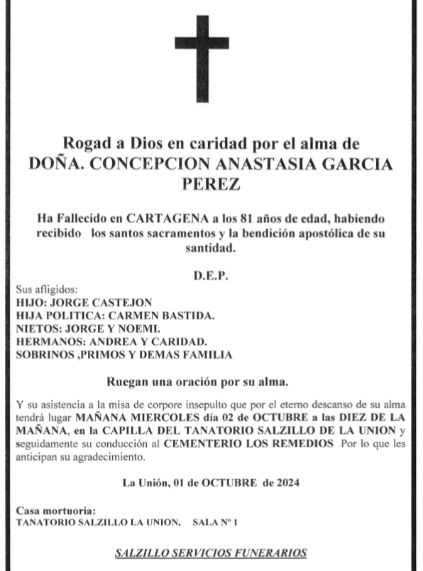 Sus afligidos hijo (Jorge Castejón), hija política (Carmen Bastida), nietos (Jorge y Noemí), hermanos (Andrea y Caridad), sobrinos, primos y demás familia ruegan una oración por su alma y su asistencia a la misa de 'corpore insepulto' que por el eterno descanso de su alma tendrá lugar este miércoles, 2 de octubre, a las diez de la mañana, en la capilla del Tanatorio Salzillo de La Unión y, seguidamente, su conducción al cementerio de Nuestra Señora de los Remedios de Cartagena, por lo que les anticipan su agradecimiento.