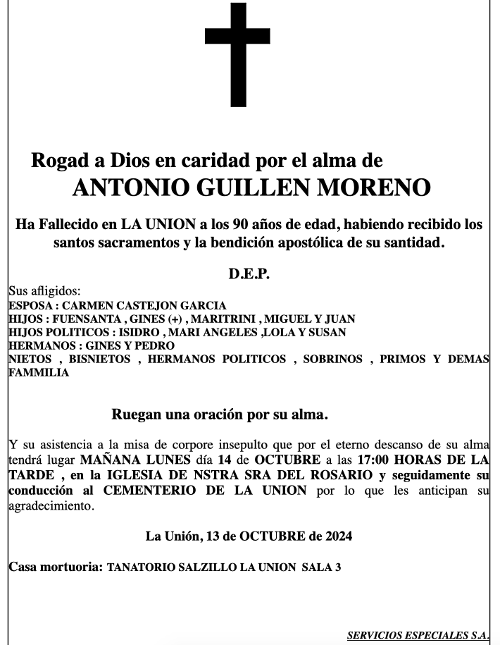 Sus afligidos esposa (Carmen Castejón García), hijos (Fuensanta, Ginés+, Maritrini, Miguel y Juan), hijos políticos (Isidro, Mariángeles, Lola y Susan), hermanos (Ginés y Pedro), nietos, bisnietos, hermanos políticos, sobrinos primos y demás familia ruegan una oración por su alma y su asistencia a la misa de corpore insepulto que por el eterno descanso de su alma tendrá lugar este lunes, 14 de octubre, a las cinco de la tarde, en la iglesia de Nuestra Señora del Rosario e La Union y, seguidamente, su conducción al cementerio de la misma localidad, por lo que les anticipan su agradecimiento.
