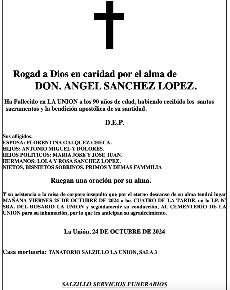 Sus afligidos esposa (Florentina Gálquez Checa), hijos (Antonio Miguel y Dolores), hijos políticos (María José y José Juan), hermanos (Lola y Rosa Sánchez López), nietos, bisnietos, sobrinos, primos y demás familia ruegan una oración por su alma y su asistencia a la misa de 'corpore insepulto' que por el eterno descanso de su alma tendrá lugar este viernes, 25 de octubre, a las cuatro de la tarde, en la iglesia parroquial de Nuestra Señora del Rosario de La Unión y, seguidamente, su conducción al cementerio de La Unión para su inhumación, por lo que les anticipan su agradecimiento.