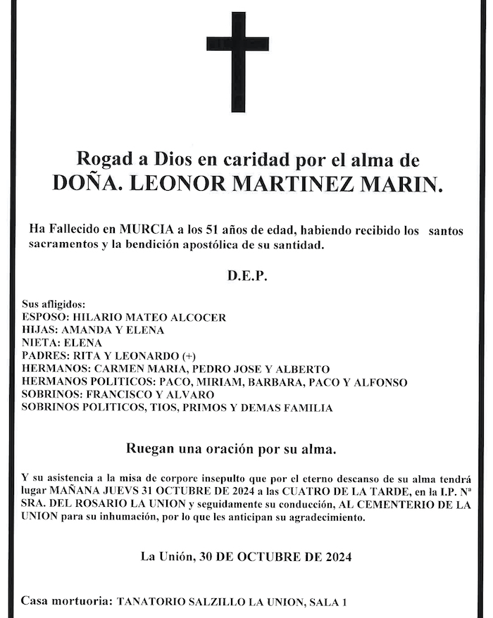Sus afligidos esposo (Hilario Mateo Alcocer), hijas (Amanda y Elena), nieta (Elena), padres (Rita y Leonardo+), hermanos (Camren María, Pedro José y Alberto), hermanos políticos (Paco, Miriam, Bárbara, Paco y Alfonso), sobrinos (Francisco y Álvaro), sobrinos políticos, tíos, primos y demás familia ruegan una oración por su alma y su asistencia a la misa de 'corpore insepulto' que por el eterno descanso de su alma tendrá lugar este jueves, 31 de octubre, a las cuatro de la tarde, en la iglesia parroquial de Nuestra Señora del Rosario de La Unión, y seguidamente su conducción al cementerio de la misma localidad para su inhumación, por lo que les anticipan su agradecimiento.