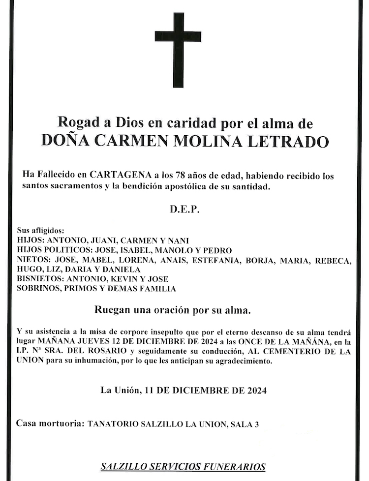 Sus afligidos hijos (Antonio, Juani, Carmen y Nani), hijos políticos (José, Isabel, Manolo y Pedro), nietos (José, Mabel, Lorena, Anais, Estefanía, Borja, María, Rebeca, Hugo Liz, Daria y Daniela), bisnietos (Antonio, Kevin y José), sobrinos, primos y demás familia ruegan una oración por su alma y su asistencia a la misa de 'corpore insepulto' que por el eterno descanso de su alma tendrá lugar este jueves, 12 de diciembre, a las 11 de la mañana en la iglesia parroquial de Nuestra Señora del Rosario y, seguidamente, su conducción al cementerio de La Unión para su inhumación, por lo que les anticipan su agradecimiento.