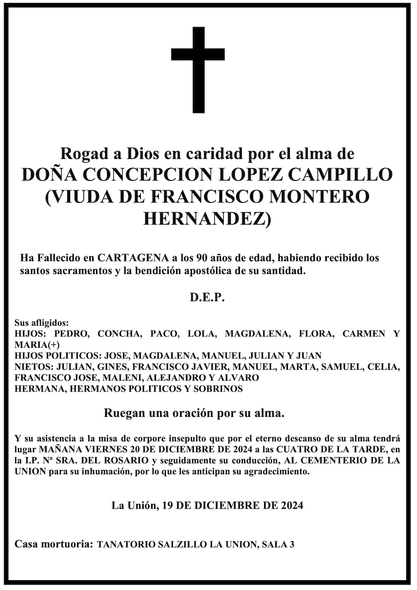 Sus afligidos hijos (Pedro, Concha, Paco, Lola, Magdalena, Flora, Carmen y María+), hijos políticos (Jose, Magdalena, Manuel, Julián y Juan), nietos (Julián, Ginés, Francisco Javier, Manuel,Marta, Samuel, Celia, Francisco José, Maleni, Alejandro y Álvaro), hermana, hermanos políticos y sobrinos ruegan una oración por su alma y su asistencia a la misa de 'corpore insepulto' que por el eterno descanso de su alma tendrá lugar este viernes, 20 de diciembre, a las cuatro de la tarde (16 horas), en la iglesia parroquial de Nuestra Señora del Rosario y, seguidamente, su conducción al cementerio de La Unión para su inhumación, por lo que les anticipan su agradecimiento.