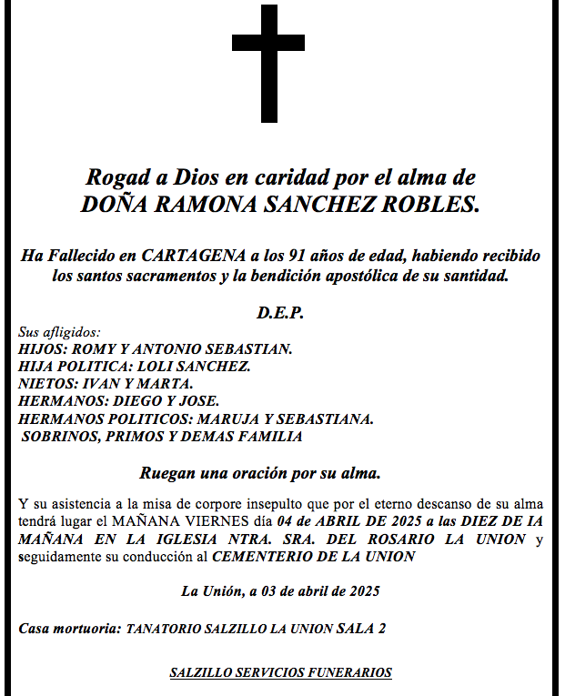 Sus afligidos hijos (Romy y Antonio Sebastián), hija política (Loli Sánchez), nietos (Iván y Marta), hermanos (Iván y Marta), hermanos (Diego y José), hermanos políticos (Maruja y Sebastiana), sobrinos, primos y demás familia ruegan una oración por su alma y su asistencia a la misa de 'corpore insepulto' que por el eterno descanso de su alma tendrá lugar el este viernes, día 4 de abril de 2025, a las diez de la mañana, en la iglesia de Nuestra Señora del Rosario de La Unión y seguidamente su conducción al cementerio de La Unión.