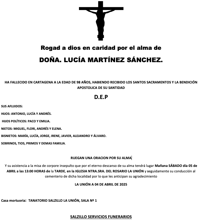 Sus afligidos hijos (Antonio, Lucía y Andrés), hijos políticos (Paco y Emilia), nietos (Miguel, Flori, Andrés y Elena), bisnietos (María, Lucía, Jorge, Irene, Javier, Alejandro y Álvaro), sobrinos, tíos, primos y demás familia ruegan una oración por su alma y su asistencia a la misa de 'corpore insepulto' que por el eterno descanso de su alma tendrá lugar este sábado, 5 de abril, a las 13 horas, en la iglesia de Nuestra Señora del Rosario de La Unión y, seguidamente, a su conducción al cementerio de dicha localidad, por lo que les anticipan su agradecimiento.