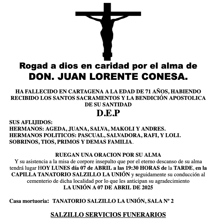 Sus afligidos hermanos (Águeda, Juana, Salva, Makoli y Andrés) hermanos políticos (Pascual, Salvadora, Rafi y Loli), sobrinos, tíos, primos y demás familia ruegan una oración por su alma y su asistencia a la misa de 'corpore insepulto' que por el eterno descanso de su alma tendrá lugar hoy, lunes 7 de abril, a las siete y media horas de la tarde, en la capilla del Tanatorio Salzillo La Unión y, seguidamente, a su conducción al cementerio de dicha localidad, por lo que les anticipan su agradecimiento