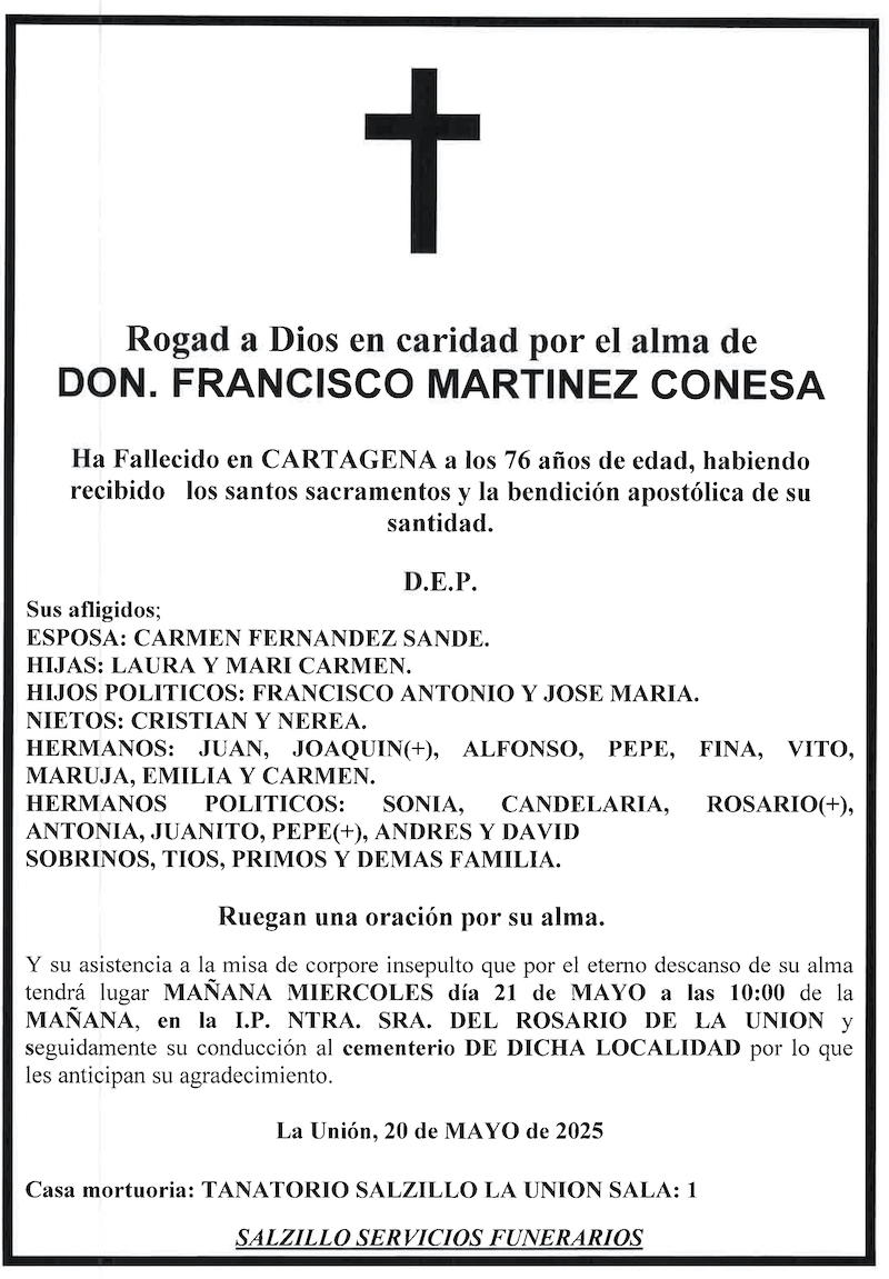 Sus afligidos esposa (Carmen Fernández Sande), hijas (Laura y Maricarmen), hijos políticos (Francisco Antonio y José María), nietos (Cristian y Nerea), hermanos (Juan, Joaquín+, Alfonso, Pepe, Fina, Vito, Maruja, Emilia y Carmen), hermanos políticos (Sonia, Candelaria, Rosario+, Antonia, Juanito, Pepe+, Andrés y David), sobrinos, primos y demás familia ruegan una oración por su alma y su asistencia a la misa de 'corpore insepulto' que por el eterno descanso de su alma tendrá lugar este miércoles, 20 de mayo, a las 10 horas, en la iglesia de Nuestra Señora del Rosario de La Unión y seguidamente a su conducción al cementerio de la localidad, por lo que les anticipan su agradecimiento.