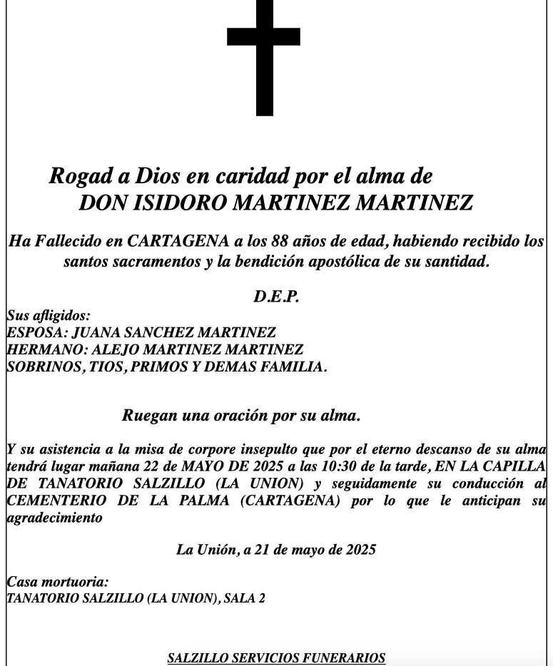 Sus afligidos esposa (Juana Sánchez Martínez), hermano (Alejo), sobrinos, tíos, primos y demás familia ruegan una oración por su alma y su asistencia a la misa de 'corpore insepulto' que por el eterno descanso de su alma tendrá lugar mañana, 22 de mayo, a las 10.30 horas de la tarde, en la capilla de Tanatorio Salzillo de La Unión, y seguidamente su conducción al cementerio de La Palma (Cartagena), por lo que le anticipan su agradecimiento