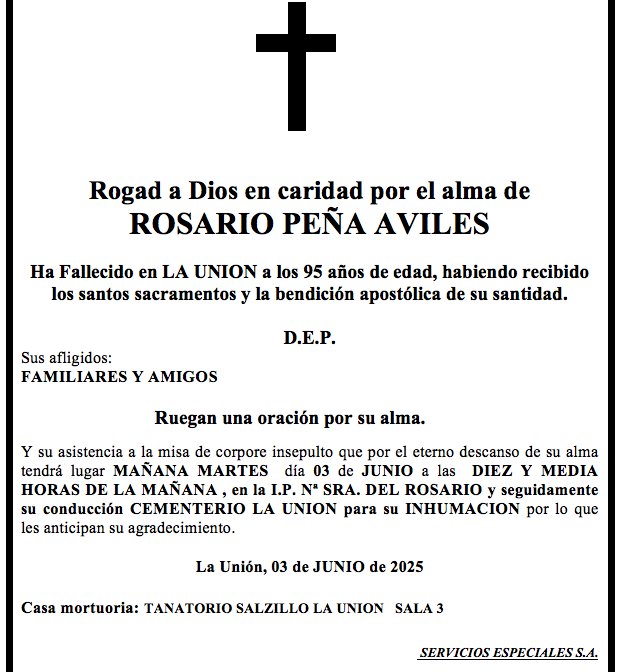 Sus afligidos familiares y amigos ruegan una oración por su alma y su asistencia a la misa de 'corpore insepulto' que por el eterno descanso de su alma tendrá lugar este martes, día 3 de junio, a las diez y media horas de la mañana en la iglesia de Nuestra Señora del Rosario de La Unión y, seguidamente, a su conducción al cementerio de La Unión para su inhumación, por lo que les anticipan su agradecimiento.