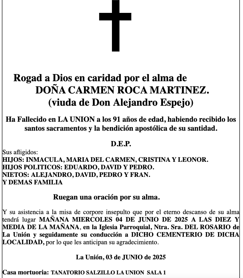 Sus afligidos hijos (Inmaculada, María del Carmen, Cristina y Leonor), hijos políticos (Eduardo, David y Pedro), nietos (Alejandro, David, Pedro y Fran) y demás familia ruegan una oración por su alma y su asistencia a la misa de 'corpore insepulto' que por el eterno descanso de su alma tendrá lugar este miércoles, 4 de junio, a las 10.30 horas en la iglesia parroquial de Nuestra Señora del Rosario de La Unión y, seguidamente, a su conducción al cementerio de dicha localidad, por lo que les anticipan su agradecimiento.