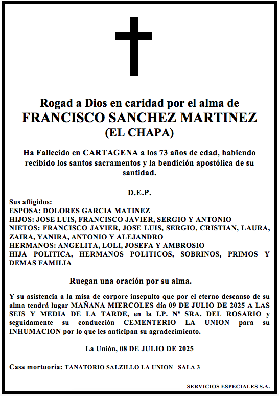 Sus afligidos esposa (Dolores García Martínez), hijos (José Luis, Francisco Javier, Sergio y Antonio), nietos (Francisco Javier, José Luis, Sergio, Cristian, Laura, Zaira, Yanira, Antonio y Alejandro), hermanos (Angelita, Loli, Josefa y Ambrosio), hija política, hermanos políticos, sobrinos, primos y demás familia ruegan una oración por su alma y su asistencia a la misa de 'corpore insepulto' que por el eterno descanso de su alma tendrá lugar este miércoles, día 9 de julio de 2025, a las 18.30 horas en la iglesia de Nuestra Señora del Rosario y, seguidamente, a su conducción al cementerio de La Unión para su inhumación, por lo que les anticipan su agradecimiento.