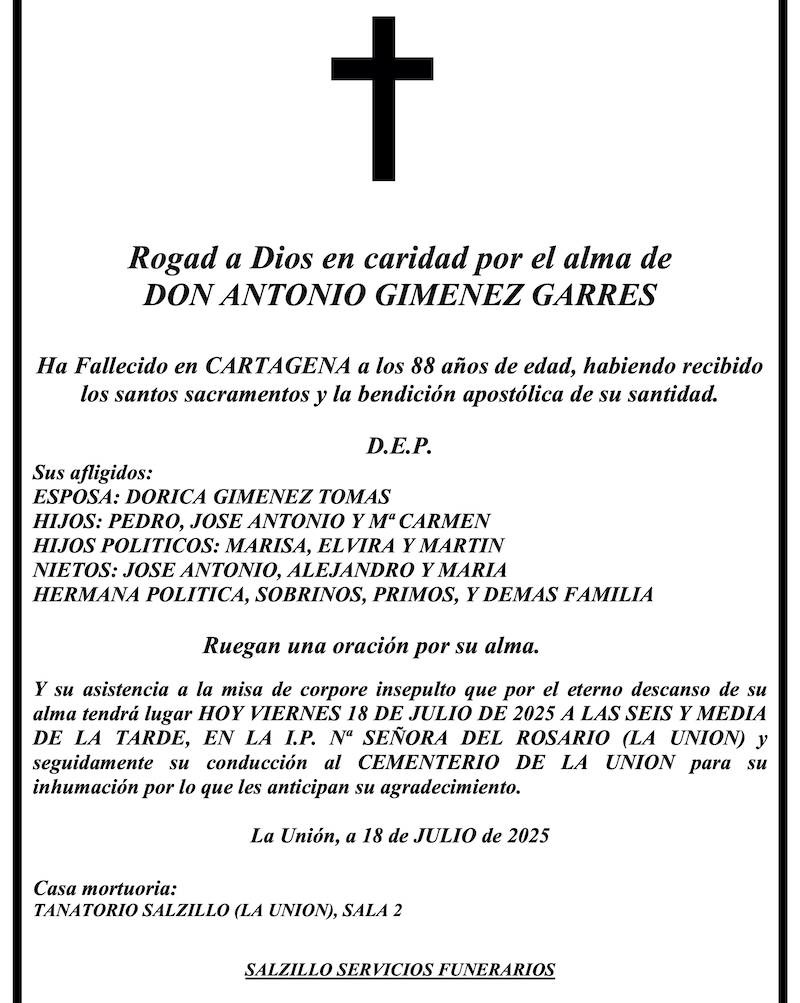 Sus afligidos esposa (Dorica Giménez Tomás), hijos (Pedro, José Antonio y Mª Carmen), hijos políticos (Marisa, Elvira y Martín), nietos (José Antonio, Alejandro y María), hermana política, sobrinos, primos y demás familia ruegan una oración por su alma y su asistencia a la misa de 'corpore insepulto' que por el eterno descanso de su alma tendrá lugar hoy, viernes 18 de julio, a las 18.30 horas, en la iglesia parroquial de Nuestra Señora del Rosario (La Unión), y seguidamente su conducción al cementerio de La Unión para su inhumación, por lo que les anticipan su agradecimiento.