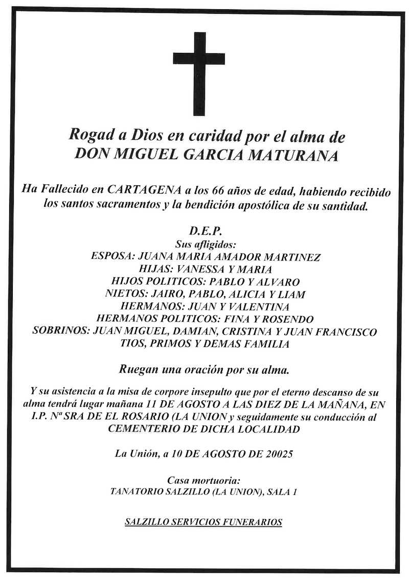 Sus afligidos esposa (Juana María Amador Martínez), hijas (Vanessa y María), hijos políticos (Pablo y Álvaro), nietos (Jairo, Pablo, Alicia y Liam), hermanos (Juan y Valentina), hermanos políticos (Fina y Rosendo), sobrinos (Juan Miguel, Damián, Cristina y Juan Francisco),  tíos, primos y demás familia ruegan una oración por su alma y su asistencia a la misa de 'corpore insepulto' que, por el eterno descanso de su alma, tendrá lugar este lunes, 11 de agosto, a las 10 de la mañana, en la iglesia de Nuestra Señora del Rosario de La Unión y, seguidamente, a su conducción al cementerio de la misma localidad.
