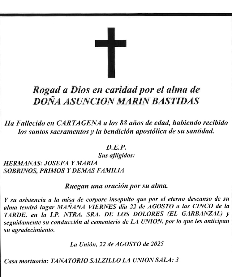 Sus afligidas hermanas (Josefa y María), sobrinos, primos y demás familia ruegan una oración por su alma y su asistencia a la misa de 'corpore insepulto' que por el eterno descanso de su alma tendrá lugar este viernes, día 22 de agosto, a las 17 horas, en la iglesia parroquial de Nuestra Señora de los Dolores, de El Garbanzal (La Unión), y, seguidamente, a su conducción al cementerio de La Unión, por lo que les anticipan su agradecimiento.