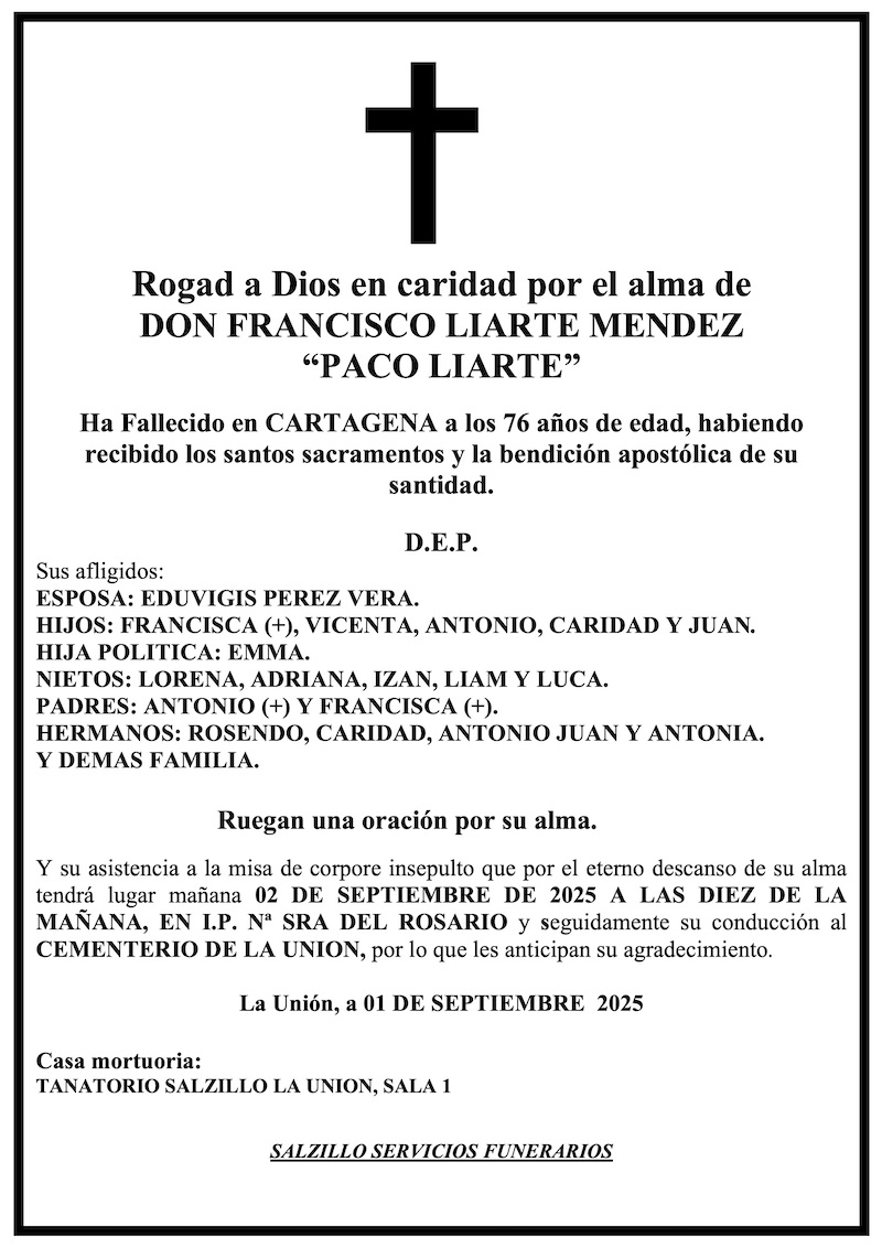 'Paco Liarte' ha fallecido en Cartagena a los 76 años de edad, habiendo recibido los santos sacramentos y la bendición apostólica de su santidad. Rogad a Dios en caridad por su alma. Era caballero de la Orden de Santa Bárbara de La Unión y fue presidente durante muchos años de la Agrupación de María Magdalena de la Semana Santa Minera.