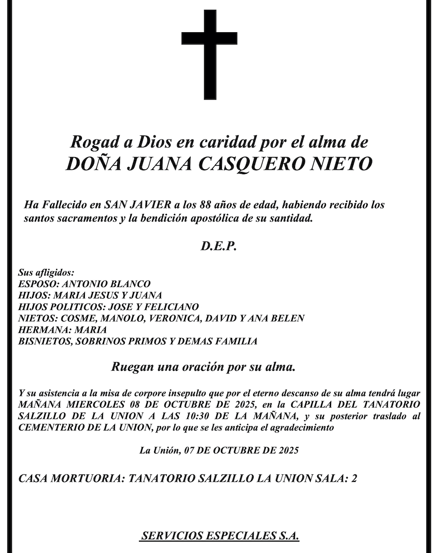 Sus afligidos esposo (Antonio Blanco), hijos (María Jesús y Juana), hijos políticos (José y Feliciano), nietos (Cosme, Manolo, Verónica, David y Ana Belén), hermana (María), bisnietos, sobrinos, primos y demás familia ruegan una oración por su alma y su asistencia a la misa de 'corpore insepulto' que por el eterno descanso de su alma tendrá lugar mañana, miércoles 8 de octubre de 2025, en la capilla del tanatorio Salzillo, a las 10.30 horas, y a su posterior traslaso al cementerio de La Unión, por lo que se les anticipa el agradecimiento