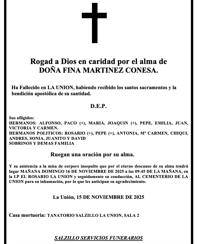 Sus afligidos hermanos (Alfonso, Paco+, María, Joaquín+, Pepe, Emilia, Juan, Victoria y Carmen), hermanos políticos (Rosario+, Pepe+, Antonia, Mª Carmen, Chiqui, Andrés, Sonia, Juanito y David), sobrinos y demás familia ruegan una oración por su alma y su asistencia a la misa de 'corpore insepulto' que por el eterno descanso de su alma tendrá lugar este domingo, 16 de noviembre de 2025, a las diez menos cuarto de la mañana en la iglesia parroquial de Nuestra Señora del Rosario de La Unión y, seguidamente, a su conducción al cementerio de La Unión para su inhumación, por lo que les anticipan su agradecimiento.