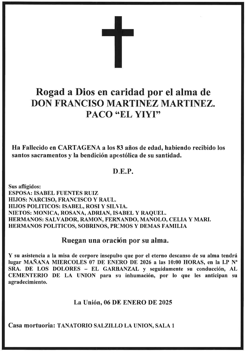Sus afligidos espoa (Isabel Fuentes Ruiz), hijos (Narciso, Francisco y Raúl), hijos políticos (Isabel, Rosi y Silvia), nietos (Mónica, Rosana, Adrián, Isabel y Raquel), hermanos (Salvador, Ramón, Fernando, Manolo, Celia y Mari), hermanos políticos, sobrinos, primos y demás familia ruegan una oración por su alma y su asistencia a la misa de ‘corpore insepulto’ que por el eterno descanso de su alma tendrá lugar este miércoles, 7 de enero, a las diez de la mañana en la iglesia parroquial de Nuestra Señora de los Dolores de El Garbanzal y, seguidamente, a su conducción al cementerio de La Unión para su inhumación, por lo que les anticipan su agradecimiento.