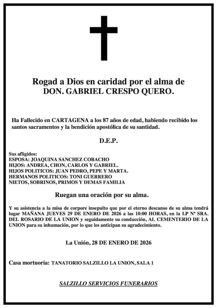 Sus afligidos esposa (Joaquina Sánchez Cobacho), hijos (Andrea, Chon, Carlos y Gabriel), hijos políticos (Juan Pedro, Pepe y Marta), hermanos políticos (Toni Guerrero), nietos, sobrinos, primos y demás familia ruegan una oración por su alma y su asistencia a la misa de ‘corpore insepulto’ que por el eterno descanso de su alma tendrá lugar este jueves, 29 de enero, a las diez de la mañana en la iglesia parroquial de Nuestra Señora del Rosario de La Unión y, seguidamente, a su conducción al cementerio de la misma localidad para su inhumación, por lo que les anticipan su agradecimiento.