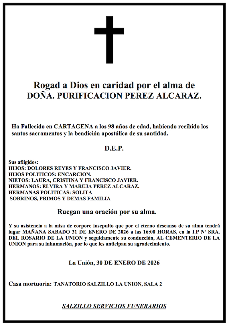 Sus afligidos hijos (Dolores Reyes y Francisco Javier), hija política (Encarnación), nietos (Laura, Cristina y Francisco Javier), hermanos (Elvira y Maruja Pérez Alcaraz), hermanas políticas (Solita), sobrinos, primos y demás familia ruegan una oración por su alma y su asistencia a la misa de ‘corpore insepulto’ que, por el eterno descanso, de su alma tendrá lugar este sábado, 31 de enero, a las cuatro de la tarde, en la iglesia parroquial de Nuestra Señora del Rosario de La Unión y, seguidamente, a su conducción al cementerio de La Unión para su inhumación, por lo que les anticipan su agradecimiento.