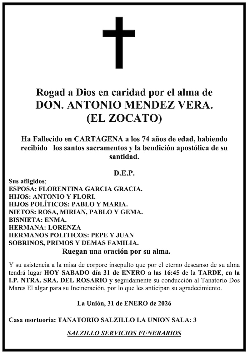 Sus afligidos esposa (Florentina García Gracia), hijos (Antonio y Flori), hijos políticos (Pablo y María), nietos (Rosa, Miran, Pablo y Gema), bisnieta (Enma), hermana (Lorenza), hermanos políticos (Pepe y Juan), sobrinos, primos y demás familia ruegan una oración por su alma y su asistencia a la misa de 'corpore insepulto' que, por el eterno descanso de su alma, tendrá lugar hoy, sábado 31 de enero, a las 16.45 horas, en la iglesia parroquial de Nuestra Señora del Rosario de La Unión y, seguidamente, a su conducción al Tanatorio Dos Mares de El Algar para su incineración, por lo que les anticipan su agradecimiento.