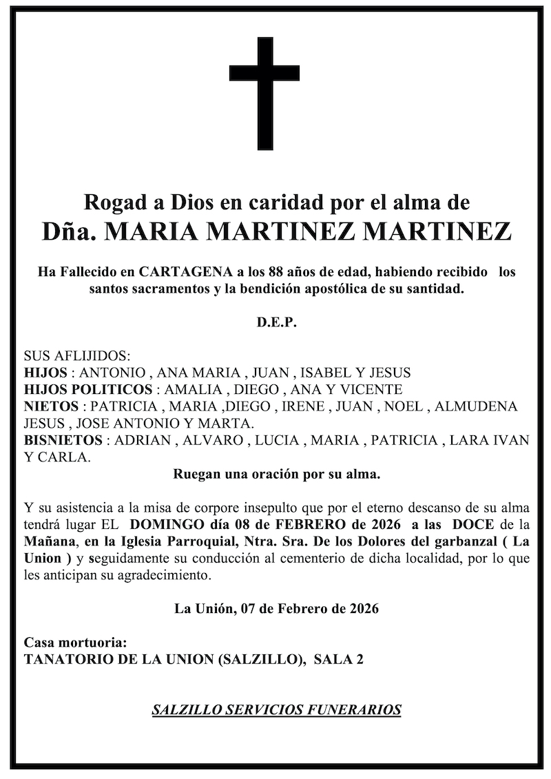 Sus afligidos hijos (Antonio, Ana María, Juan, Isabel y Jesús), hijos políticos (Amalia, Diego, Ana y Vicente), nietos (Patricia, María, Diego, Irene, Juan Noel, Almudena, Jesús, José Antonio y Marta), bisnietos (Adrián, Álvaro, Lucía, María, Patricia, Lara Iván y Carla) ruegan una oración por su alma y su asistencia a la misa de 'corpore insepulto' que por el eterno descanso de su alma tendrá lugar hoy, domingo 8 de febrero, alas 12 horas en la iglesia parroquial de Nuestra Señora de los Dolores de El Garbanzal (La Unión) y, seguidamente, a su conducción al cementerio de dicha localidad, por lo que les anticipan su agradecimiento.