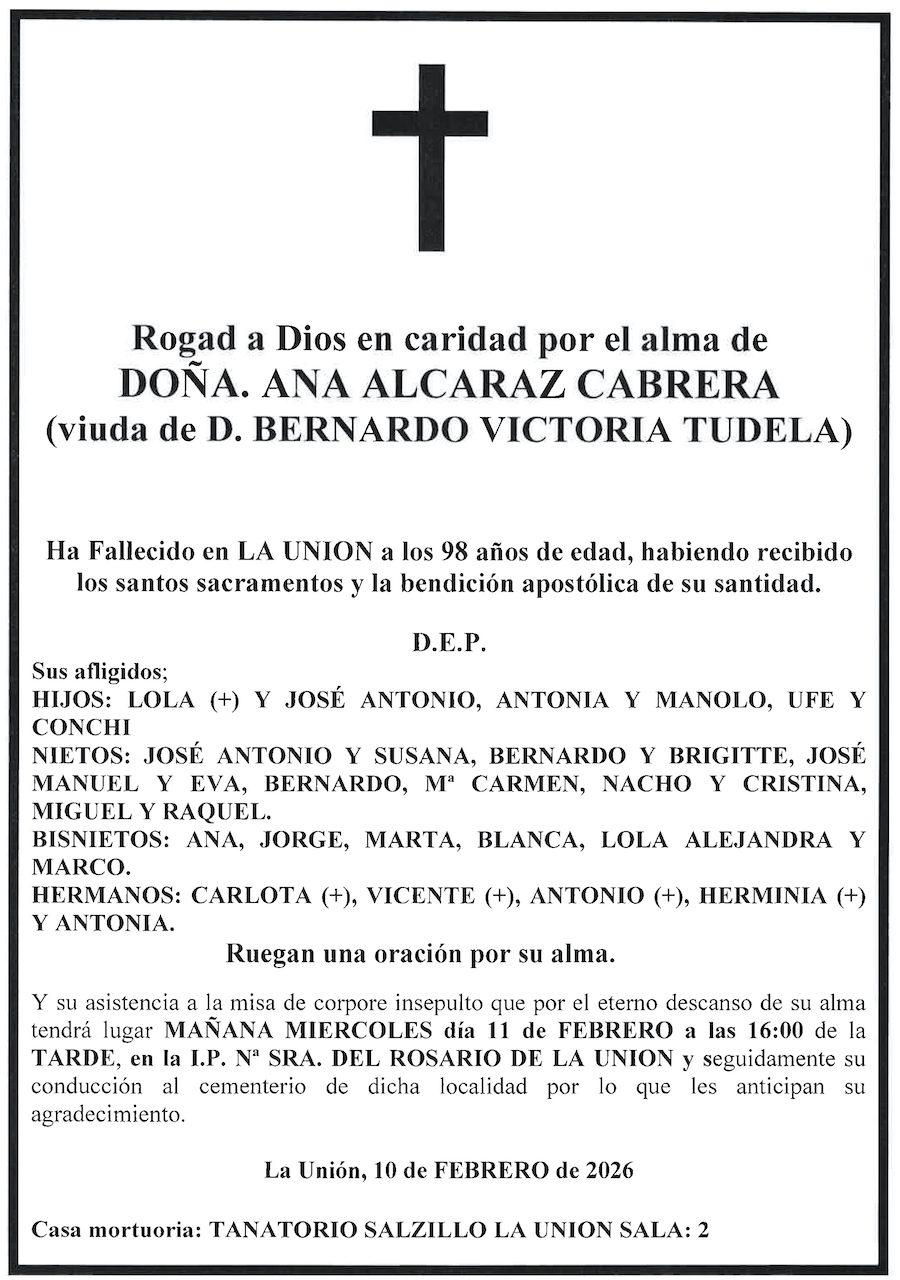 Sus afligidos hijos (Lola+ y José Antonio, Antonia y Manolo, Ufe y Conchi), nietos (José Antonio y Susana, Bernardo y Brigitte, José Manuel y Eva, Bernardo Mª Carmen, Nacho y Cristina, Miguel y Raquel), bisnietos (Ana, Jorge, Marta, Blanca, Lola, Alejandra y Maco), hermanos (Carlota+, Vicente+, Antonio+, Herminia+ y Antonia) ruegan una oración por su alma y su asistencia a la misa de 'corpore insepulto' que por el eterno descanso de su alma tendrá lugar este miércoles, 11 de febrero, a las cuatro de la tarde, en la iglesia parroquial de Nuestra Señora del Rosario de La Unión y, seguidamente, a su conducción al cementerio de dicha localidad, por lo que les anticipan su agradecimiento.