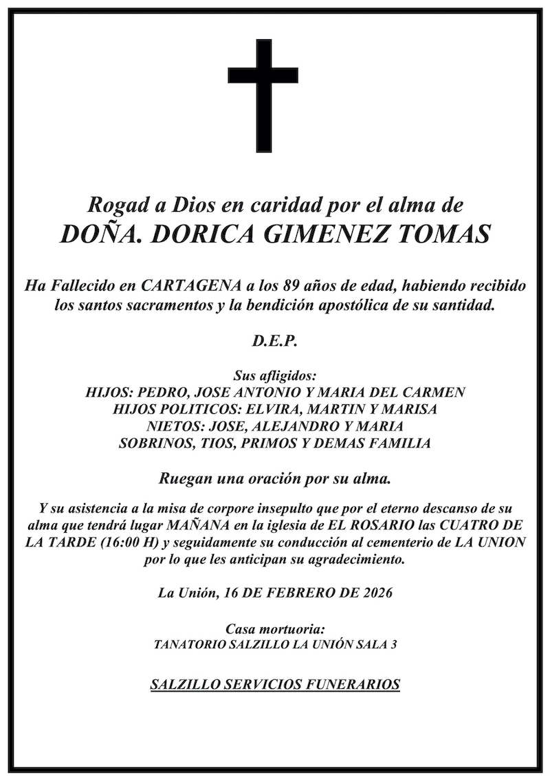 Ha fallecido en Cartagena a los 89 años de edad, habiendo recibido los santos sacramentos y la bendición apostólica de su santidad. Rogad a Dios en caridad por su alma.