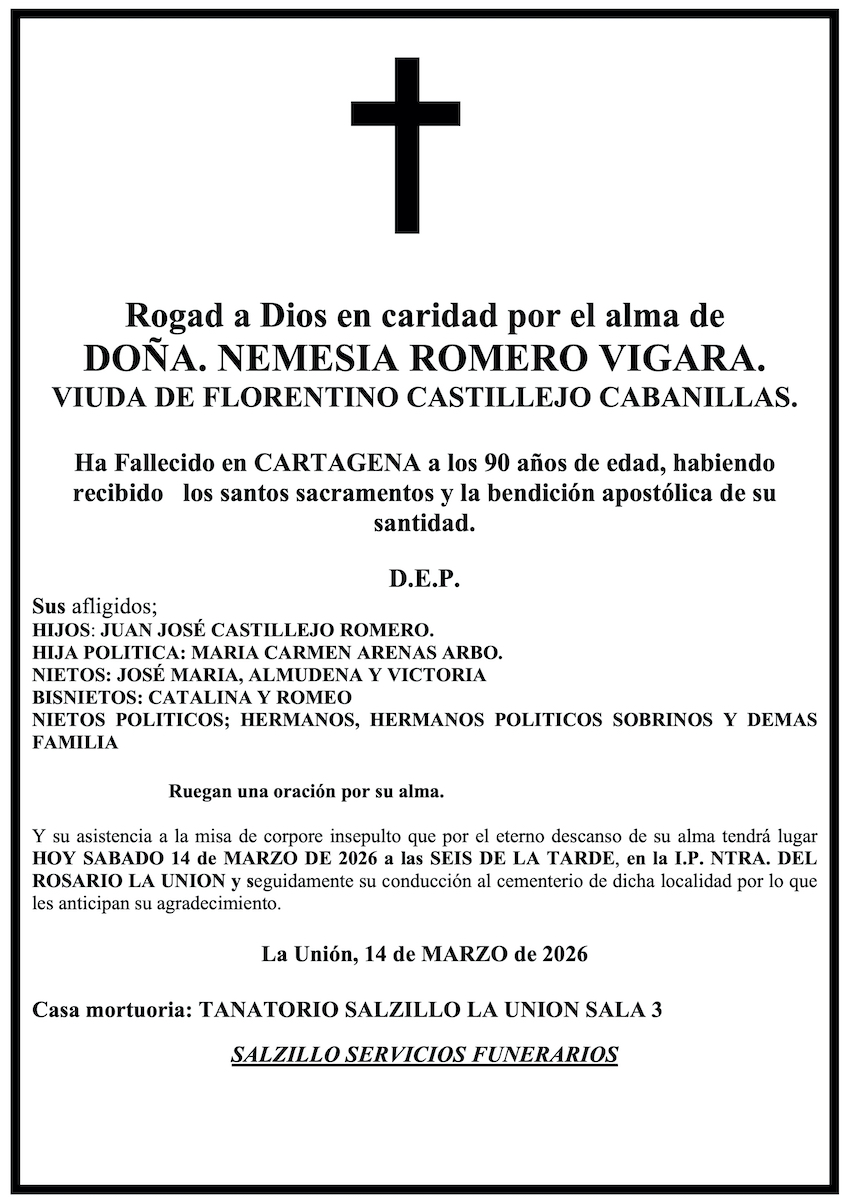 Sus afligidos hijos (Juan José Castillejo Romero), hija política (María Carmen Arenas Arbo), nietos (José María, Almudena y Victoria), bisnietos (Catalina y Romeo), nietos políticos, hermanos, hermanos políticos, sobrinos y demás familia ruegan una oración por su alma y su asistencia a la misa de 'corpore insepulto' que por el eterno descanso de su alma tendrá lugar hoy, sábado 14 de marzo, a las 18 horas, en a iglesia de Nuestra Señora del Rosario de La Unión y, seguidamente, a su conducción al cementerio de dicha localidad, por lo que les anticipan su agradecimiento.
