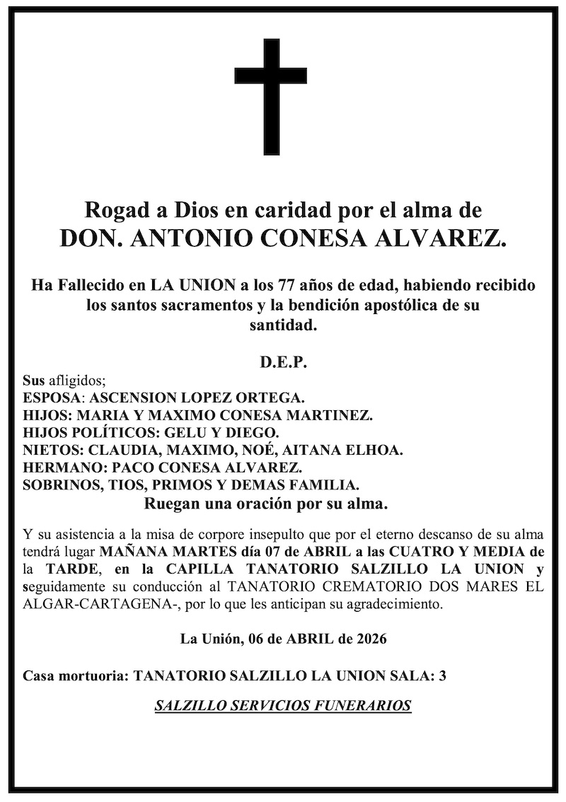 Sus afligidos esposa (Ascensión López Ortega), hijos (María y Máximo Conesa Martínez), hijos políticos (Gelu y Diego), nietos (Claudia, Máximo, Noé, Aitana y Elhoa), hermano (Paco Conesa Álvarez), sobrinos, tíos, primos y demás familia ruegan una oración por su alma y su asistencia a la misa de 'corpore insepulto' que por el eterno descanso de su alma tendrá lugar hoy, martes 7 de abril, a las 16.30 horas, en la capilla del tanatorio Salzillo La Unión y, seguidamente, a su conducción al tanatorio crematorio Dos Mares, en El Algar (Cartagena), por lo que les anticipan su agradecimiento.