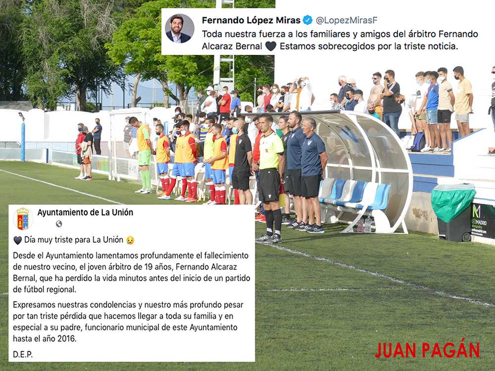 El fútbol regional dedica su jornada de este fin de semana al recuerdo de Fernando Alcaraz Bernal, el joven colegiado de La Unión fallecido el pasado domingo antes de comenzar un partido en el terreno de juego Sánchez Luengo de El Algar, un lugar donde están siendo especiales esos pequeños homenajes por parte de sus compañeros en el mundod el arbitraje y de los futbolistas, a los que se unen desde fuera del campo técnicos, directivos y espectadores.