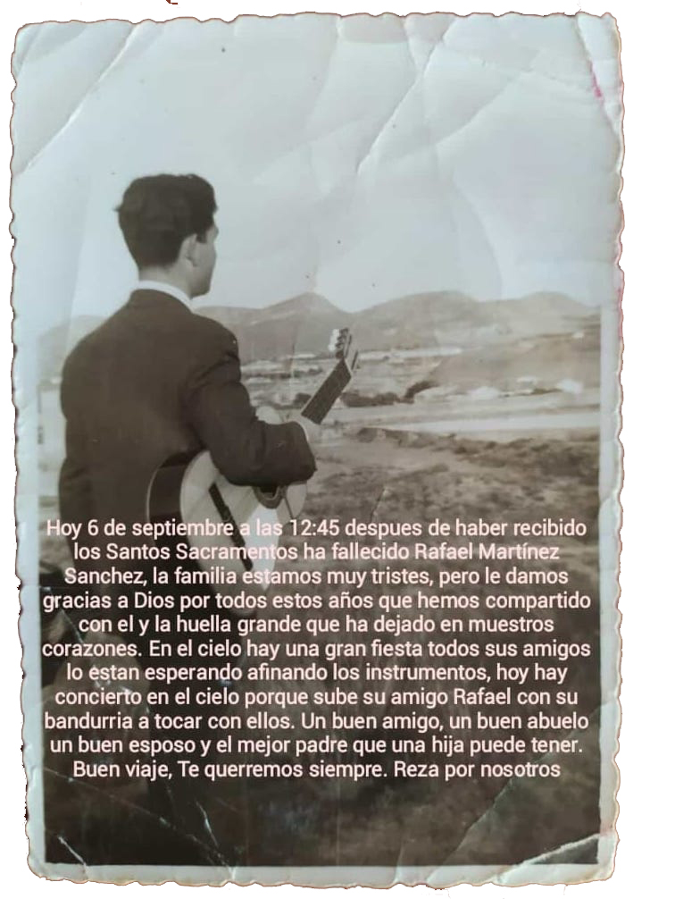 "Este 6 de septiembre, a las 12.45 horas, después de haber recibido los santos sacramentos, ha fallecido Rafael Martínez Sánchez. La familia estamos muy tristes, pero le damos gracias a Dios por todos estos años que hemos compartido con él y por l a huella grande que ha dejando en nuestros corazones.