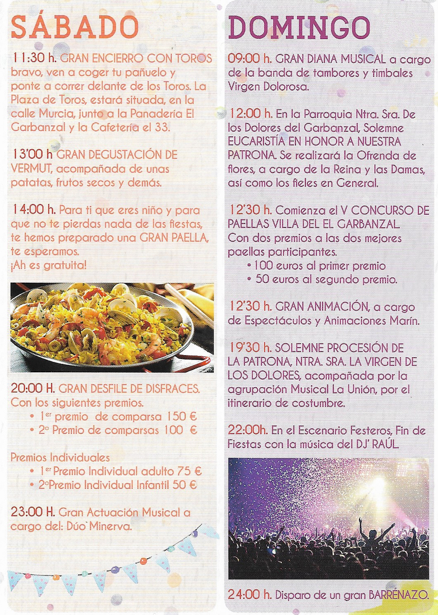 El domingo se cierra el programa con eucaristía y procesión en honor a la Virgen de los Dolores, celebración del concurso de arroces, animaciones, música y barrenazo de clausura.